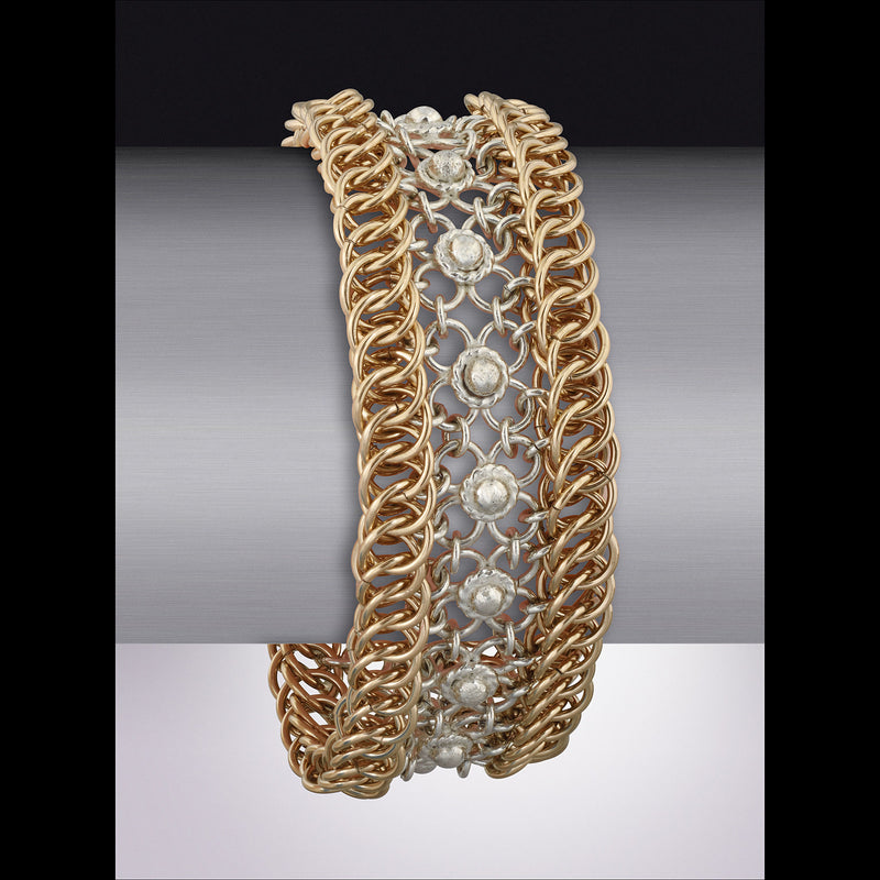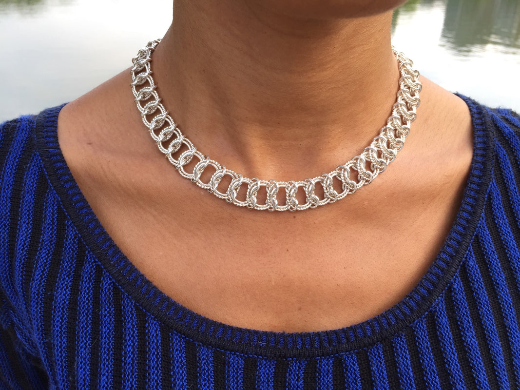 The classic sterling byzantine with 14ktgf floating obit rings makes this necklace stand out. The byzantine is a delicate weave that is slightly smaller than a #2 pencil.